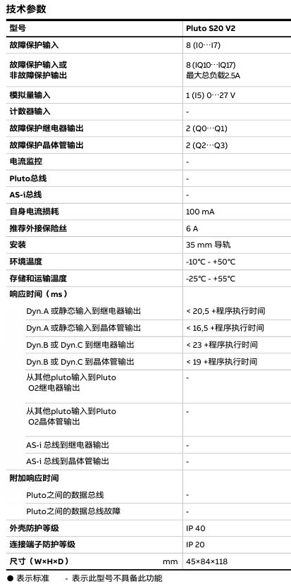 详细信息 安全PLC系列 型号:Pluto S20 V2 操作电压:24V DC 功能 / 产品描述:20点PLC(不带安全总线接口) 尺寸(W×H×D) mm:45×84×118 订货代码 : 2TLA020070R4700